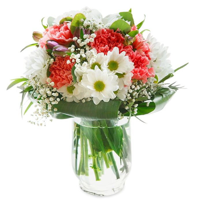 Infused with a quietly radiant joy, this carefully composed bouquet-displayed in a crisp white gift bag-embodies the freshness and skill for which Kidbrooke florists are known. Soft peachy carnations and vibrant reds unfurl in lush, textured abundance, their ruffled petals whispering of warmth and celebration. Nestled close, white daisies beam, their golden-lime centres bright with optimism, conjuring thoughts of sunlit picnics along Kidbrooke Green. Wisps of baby's breath dance between the bolder blooms, lending the arrangement a light, airy innocence, while hints of unopened, purple-tinged buds suggest new beginnings yet to unfold. Circled by a framework of deep green, glossy leaves that gather and reflect the ambient light, the bouquet is elevated-every stem chosen with expertise and care. The sturdy-handled bag positions the arrangement for effortless gifting, perfect for surprising someone special or marking a cherished occasion. Whether delivered by a local expert or given in person, this bouquet is the essence of thoughtful floristry in Kidbrooke: uplifting, fresh, and endlessly sincere. A bouquet radiates energy and tenderness, its harmonious arrangement reflecting Kidbrooke's vibrant community and love of green spaces. Seen from above on a crisp white background, this lively display is anchored by brilliant white daisies with zesty green centers, reminiscent of open meadows near Thomas Tallis School or scenic walks around Sutcliffe Park. Coral-pink carnations, full and ruffled, form cheerful layers, their rich hue warming the design and providing a joyful contrast to the daisies. Airy bunches of baby's breath tangle playfully between the larger flowers, softening the lines and adding dynamic movement. Hinting at future growth, slender alstroemeria buds in blush-pink and soft purple steal glimpses from beneath the foliage. Silvery eucalyptus and glossy green leaves complete the look, adding texture and a soothing backdrop. Crafted by a dedicated Kidbrooke florist, the bouquet embodies thoughtfulness and positivity, perfect for uplifting a loved one's spirits or brightening a home. Whether marking a special occasion or simply expressing gratitude, it brings the natural beauty and expert touch of local florists to every recipient across Kidbrooke. This radiant bouquet, assembled by attentive Kidbrooke florists, is a celebration of seasonal colour and texture. At its core, frilled coral carnations express vivacity and warmth, their densely layered petals recalling the joyful spirit found in local Kidbrooke gatherings and neighbourhood events. Surrounding the core, crisp white chrysanthemums and classic daisies with striking greenish-yellow centres lend an aura of freshness, their simple forms reminiscent of dawn blooms in Sutcliffe Park. Elfin sprays of baby's breath float gently between the larger flowers, providing a touch of airiness and a soft contrast. Not to be overlooked, a cluster of unopened magenta alstroemeria buds on the edge hints at new beauty still to unfold. All are securely cradled by a collar of deep green, glossy foliage and slender, arched leaves that frame the composition elegantly. Presented in a simple, transparent glass vase filled with water, the sturdy green stems below the surface add depth and clarity. Flooded with gentle, even light, every petal and leaf is displayed in vivid relief, conjuring feelings of comfort, cheer, and celebration-perfect for brightening any Kidbrooke home or offering as a heartfelt thank you.